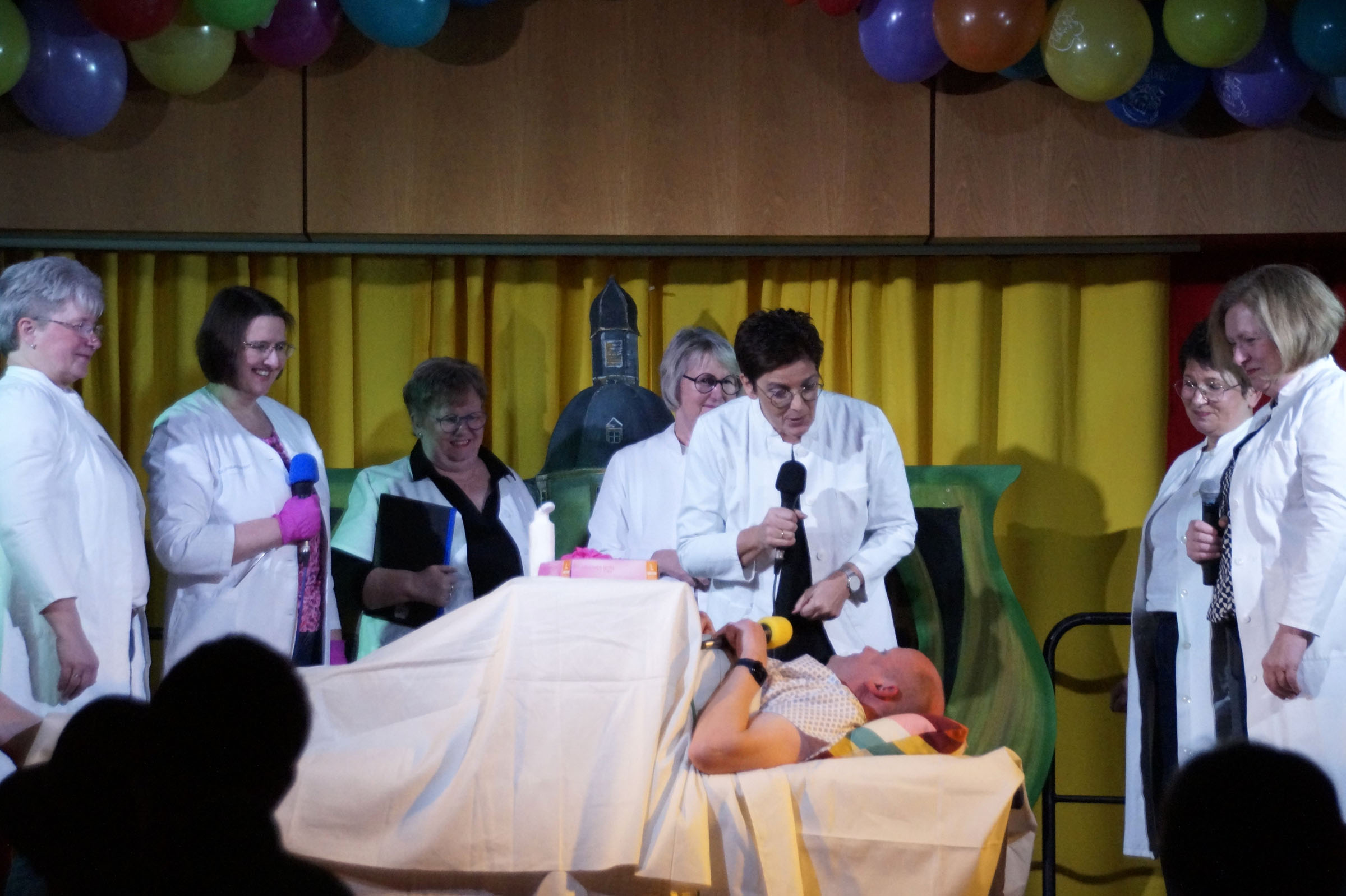 Ein weiterer Höhepunkt war der Arzt-Sketch um den Patienten „Herr Ortloff“, gespielt von Klaus Hölting. Unterstützt von Claudia Heising, Petra Voß, Ulla Lüke-Pöppel, Mary Ellenbürger, Ingrid Kröger, Susanne Kneuper und Daniela Hölting entwickelte sich eine turbulente Untersuchung, bei der sich das vermeintliche Missgeschick mit Hund Balou als etwas ganz anderes herausstellte.
